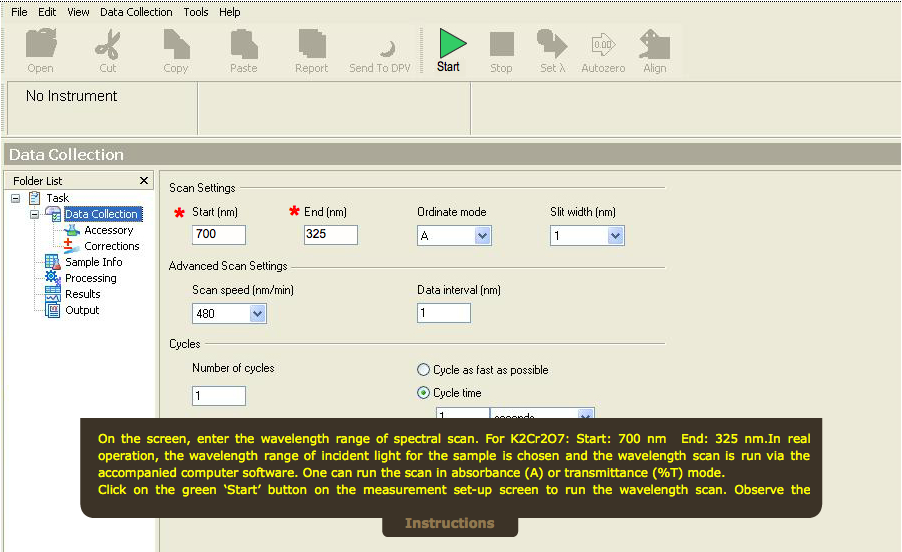For K2Cr2O7: Start: 700 nm End: 325 nm. In real operation, the wavelength range of incident light for the sample is chosen and the wavelength scan is run via the accompanied computer software. One can run the scan in absorbance (A) or transmittance (%T) mode.